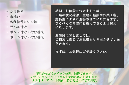 衣料プレス、検品、補修など、物流の二次加工を全般に行っており、